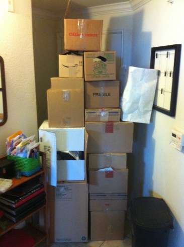 That’s right. A floor to ceiling “wall” of boxes built by me to greet Adam when he arrives home from work. I placed it strategically in the front door so he can open the door without actually knocking down the boxes.