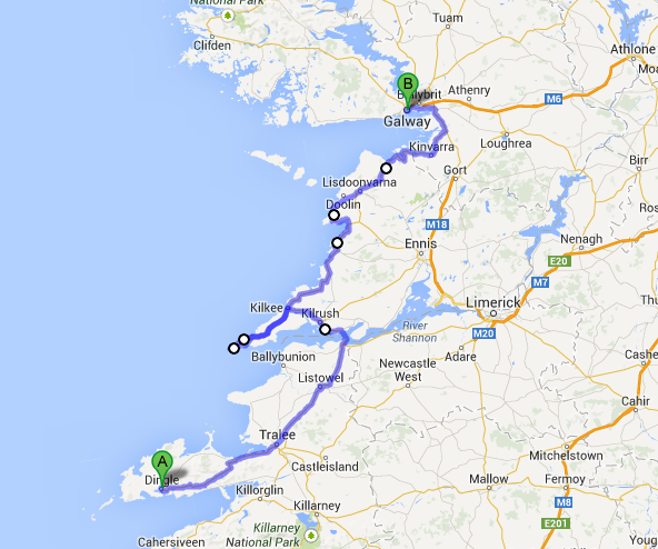 Our route today was pretty straight-forward, primarily driving north, along the coast, and taking a ferry across the River Shannon.